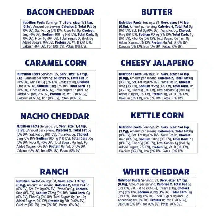 Inkluderede smage: hvid cheddar, nacho cheddar, ranch, smør, kedelmajs, karamelmajs, baconcheddar og cheesy jalapeno
